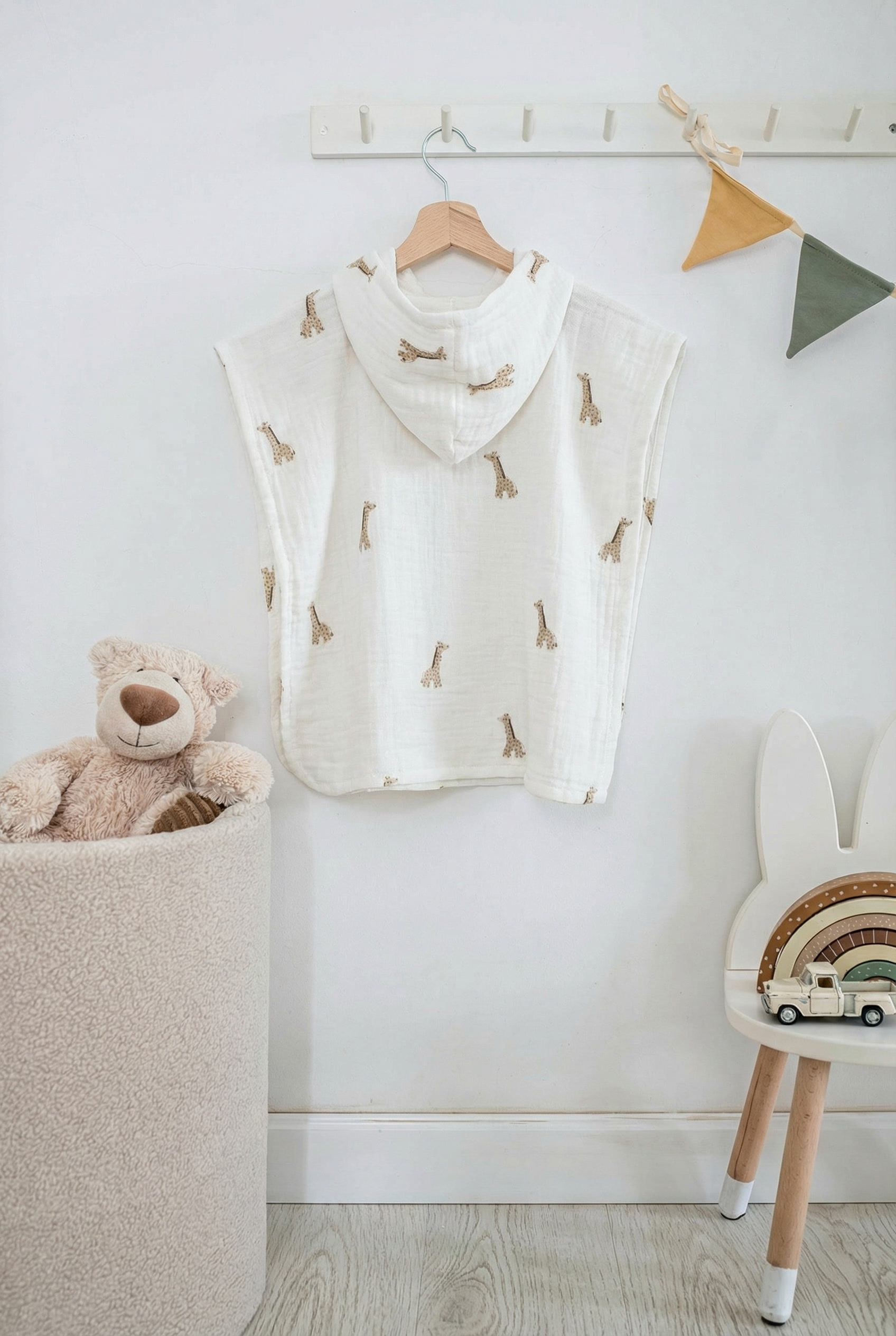 In a very absorbent 100% cotton double gauze poncho, it dries and warms children up when they get out of the bath or the pool!